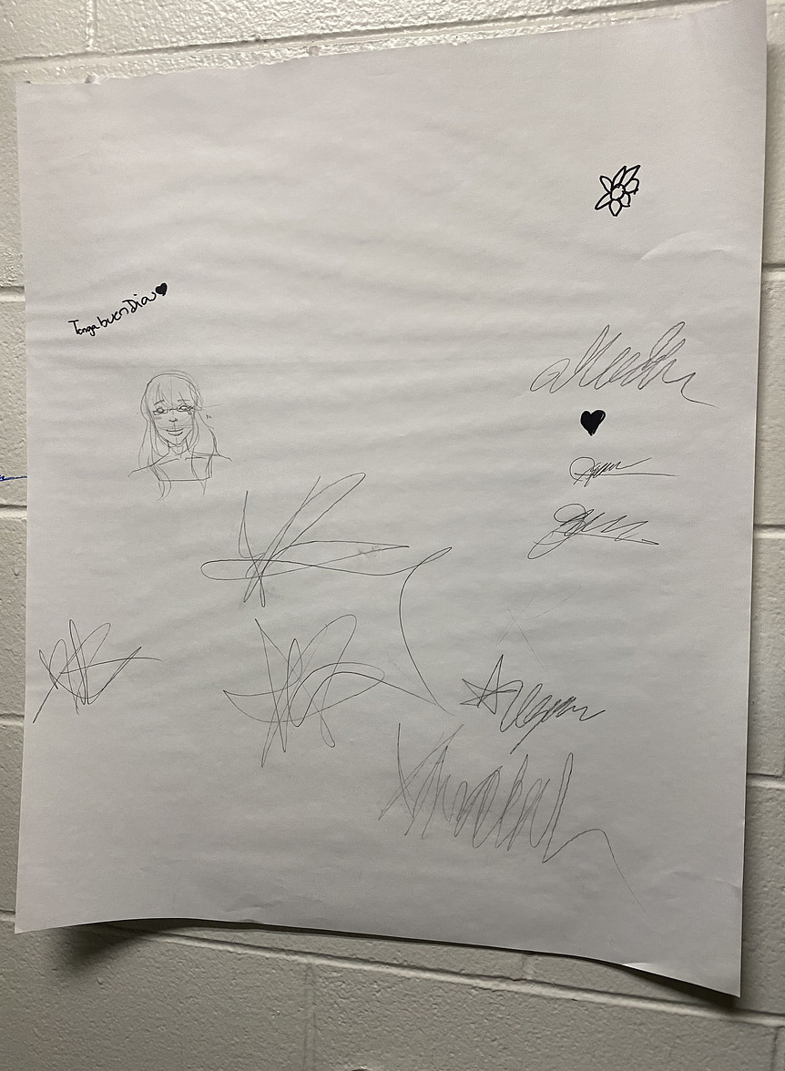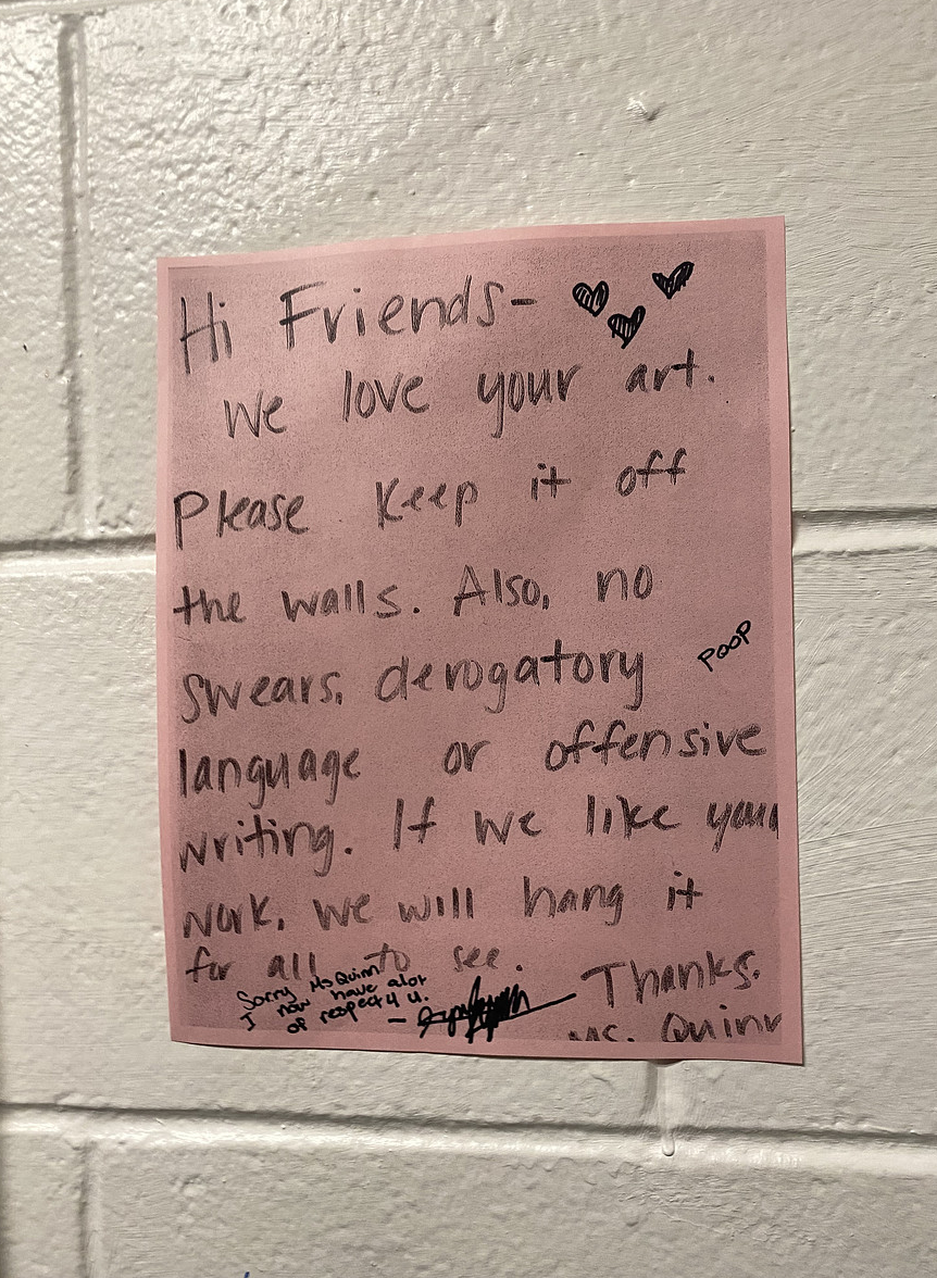 Quinn was not the only one to come up with the idea of hanging up pieces of paper; she was one of the few female administrative and hallway staff in a meeting about the bathrooms. “We were just trying to try something new, and I was noticing that some of the doodles were just that, doodles, or someone signing their name, or someone playing a tic tac toe game—things that I thought, ‘If this is going to keep happening and this…is not hurtful or having a major impact on our day to day and it could be solved by just putting up a piece of white paper instead of students doing that on the walls, why not try?’” explained Quinn.