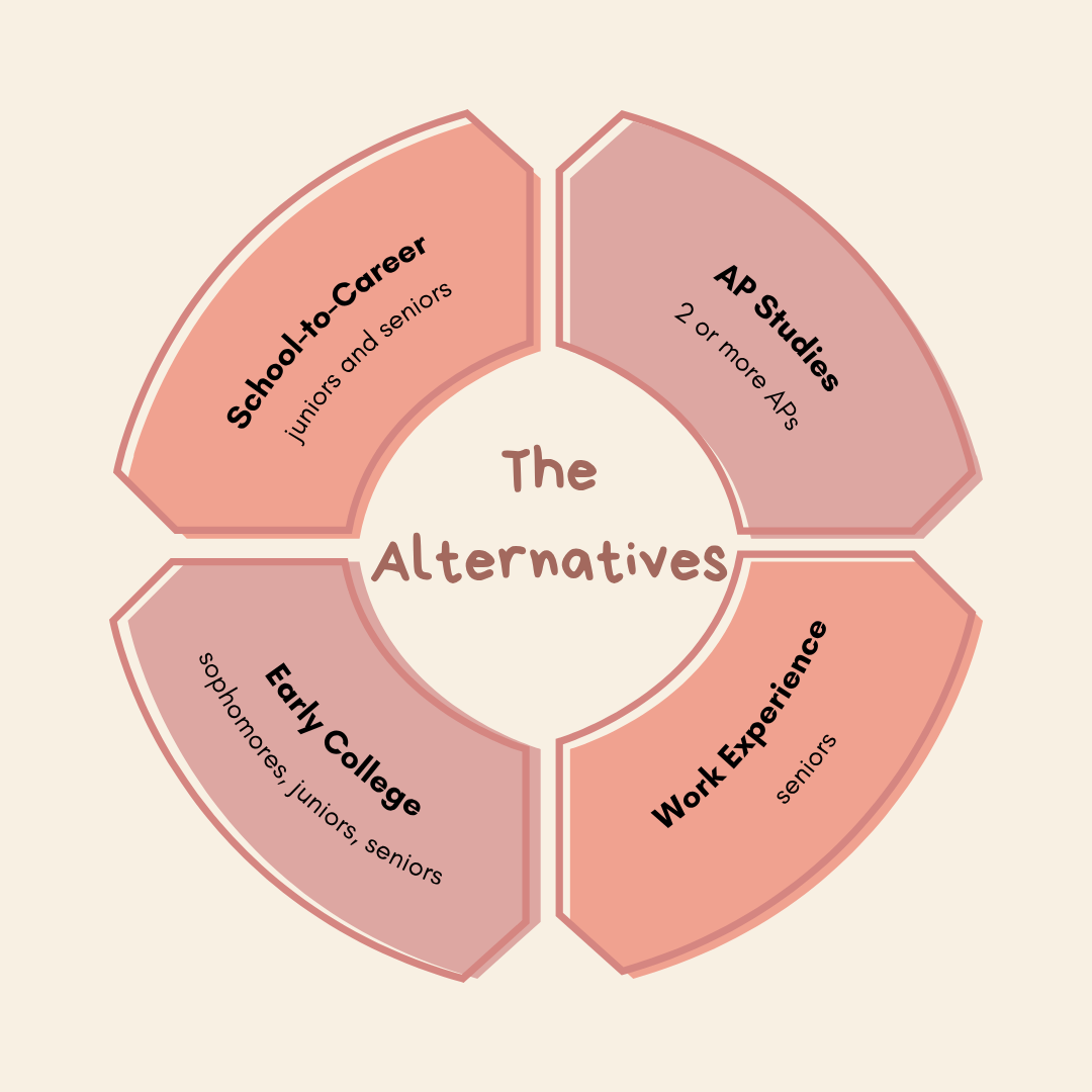 One of Gabbay’s concerns was that the other alternatives were only applicable to certain student populations. Only juniors and seniors can apply to School-to-Career and Early College—sophomores can apply to EC, but it’s rare—while work experience outside of school is exclusively available to seniors.