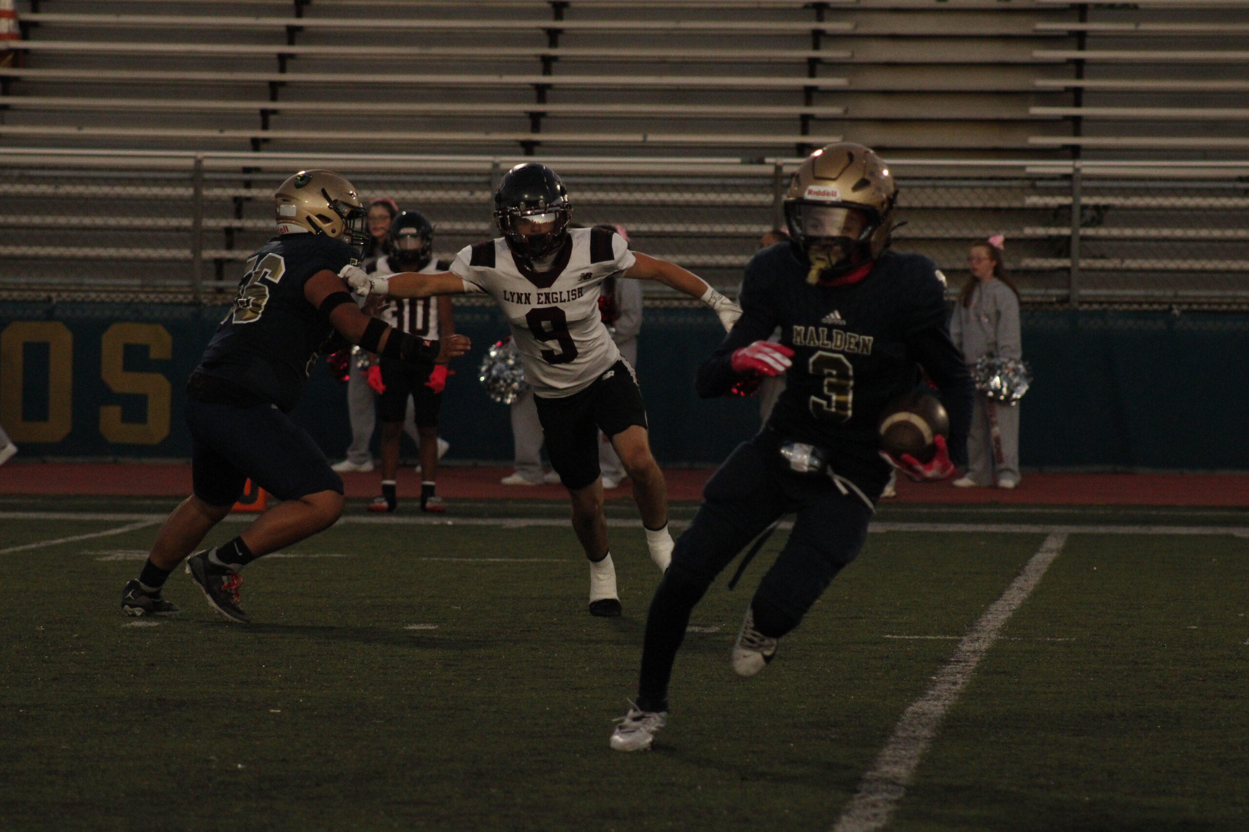 The game started exceptionally well for Malden when senior safety and return man Matthew Candelario Da Costa was able to return the opening kickoff for 32 yards, setting Malden at Lynn English’s 38-yard line. However, momentum swiftly changed after sophomore running back, linebacker, and Captain Jayden McGuffie fumbled the ball on the opening play, which Lynn English recovered at their own 30.