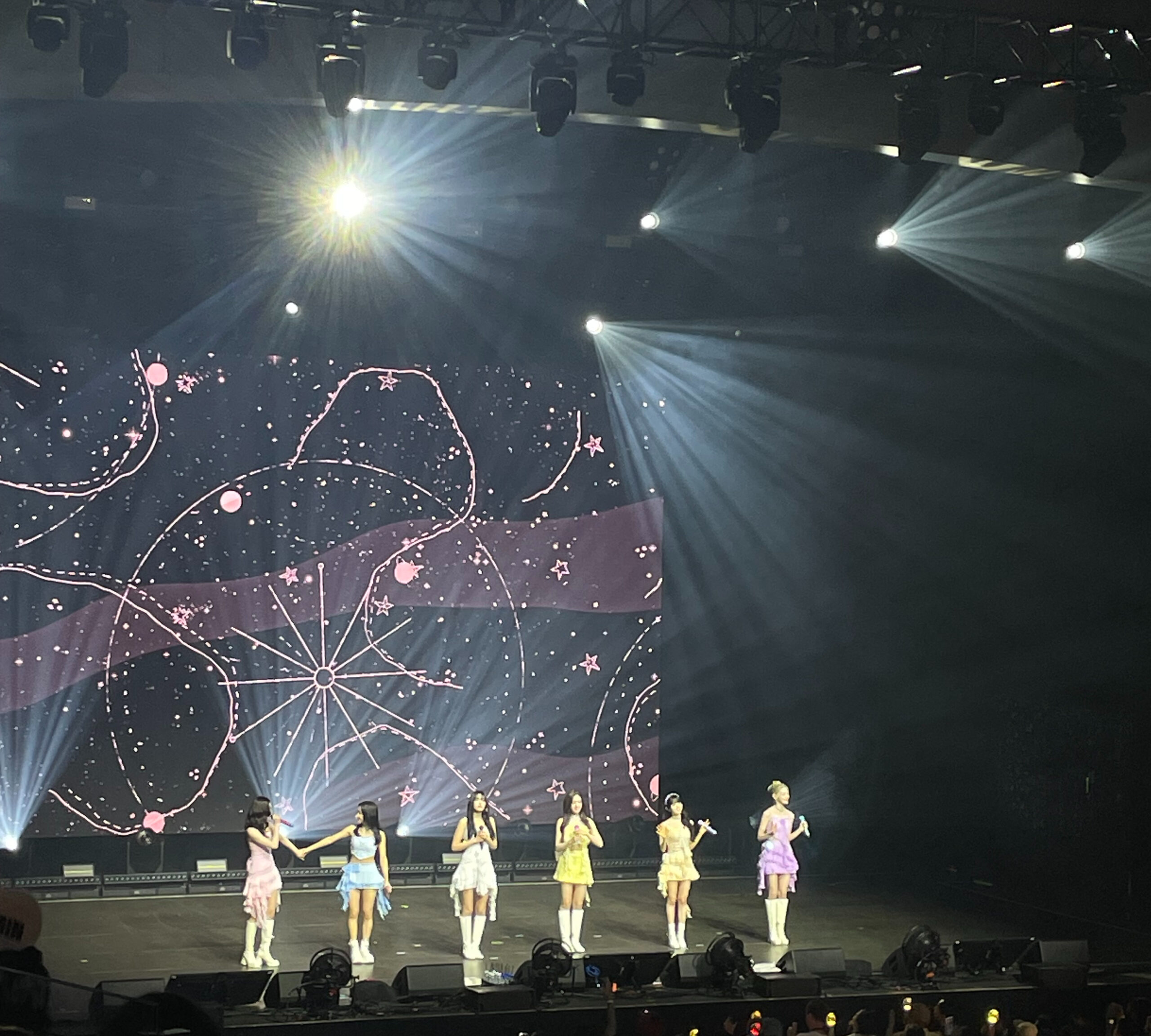 During their next break, they interacted with the crowd. The members talked with their fans, asking if they’d enjoyed the songs and mentioning the crowd’s big energy. Jokingly, they asked for food recommendations in Boston, like seafood and cannolis. One of the members, Sieun, asked the crowd if anyone attended any nearby universities, specifically Harvard, mentioning that when she was younger, she always wanted to go to Harvard.