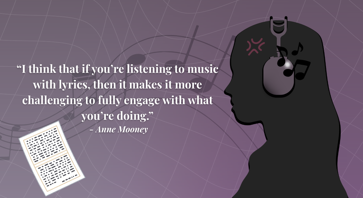 Still, not everyone finds music playing while working to be helpful. English teacher Anne Mooney admits she has difficulty hearing her own thoughts since she “can’t tune music out.”