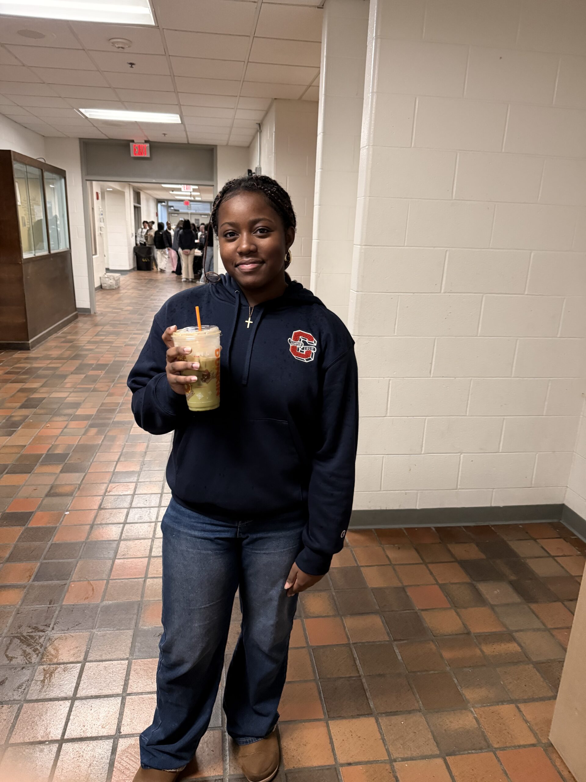 Neitsy Philome drinking a Dunkin drink before step practice. DYLAN CHEN