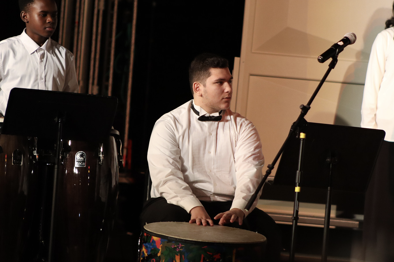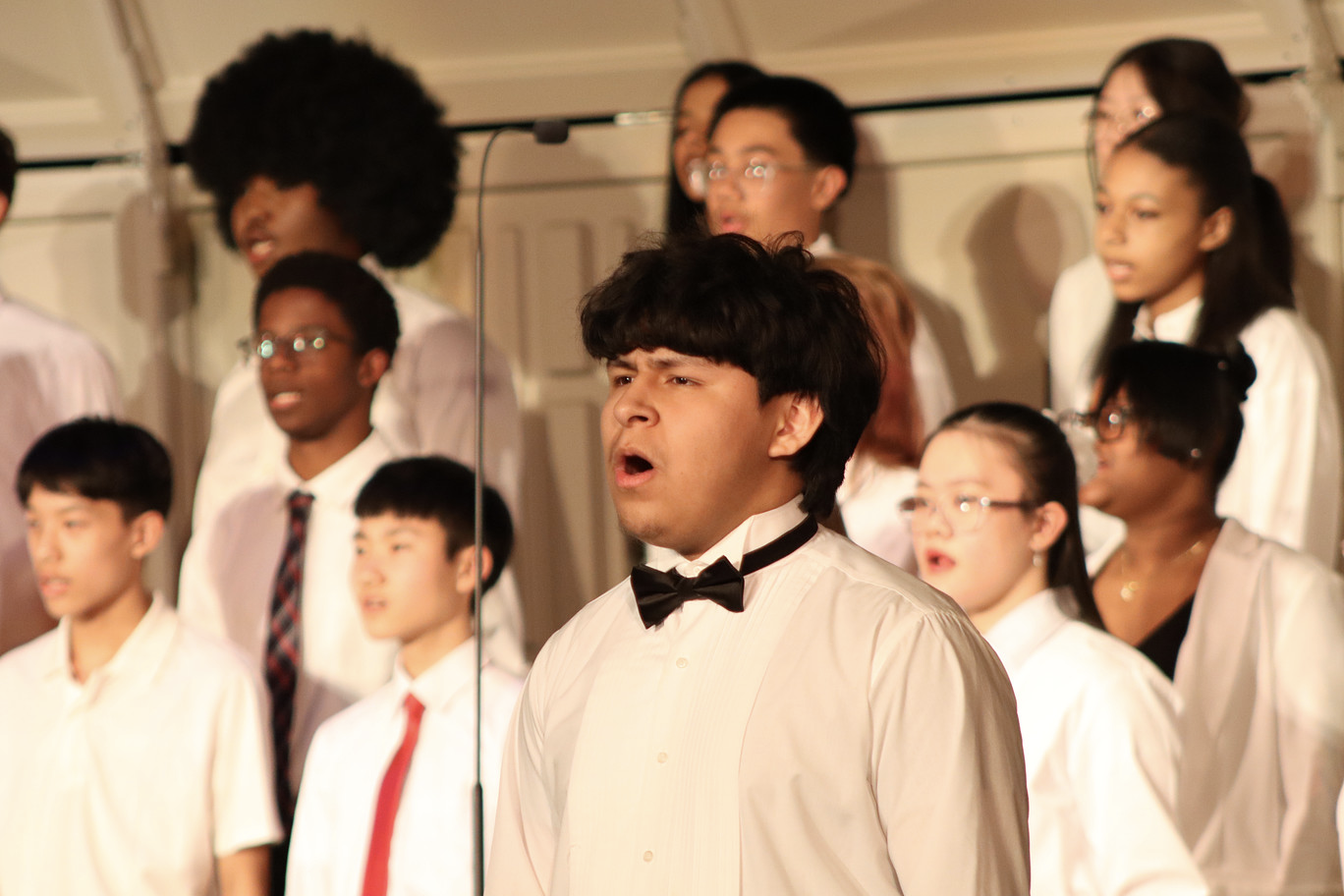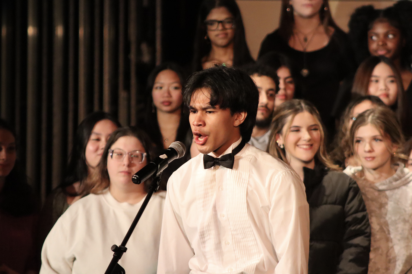 The Mixed Chorus then switched to the Nigerian Carol, “Betelehemu,” which was also arranged by Andy Beck and translates to Bethlehem—the birthplace of Jesus Christ. This carol was sung in Yoruba, a language spoken by nearly 50 million people in West Africa. Throughout their performance, the Mixed Chorus swayed from side-to-side and clapped rhythmically while accompanied by seniors Kenny Wong, Daniel Flores, Bass Section Leader Matt Jason Chan, and Christopher Arruda-Ciulla who played percussion alongside freshmen Simon Nyoike and Ernest Chen.