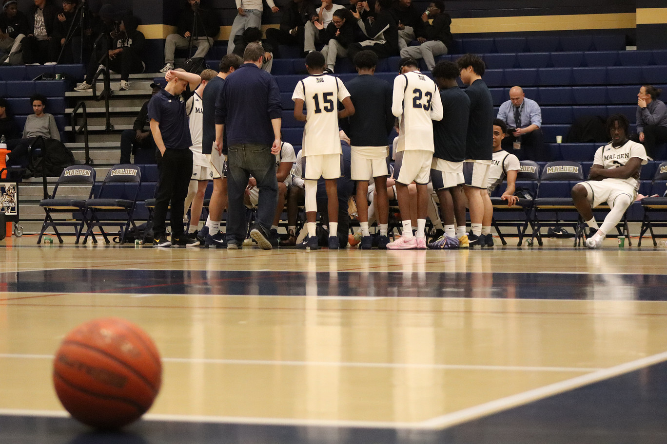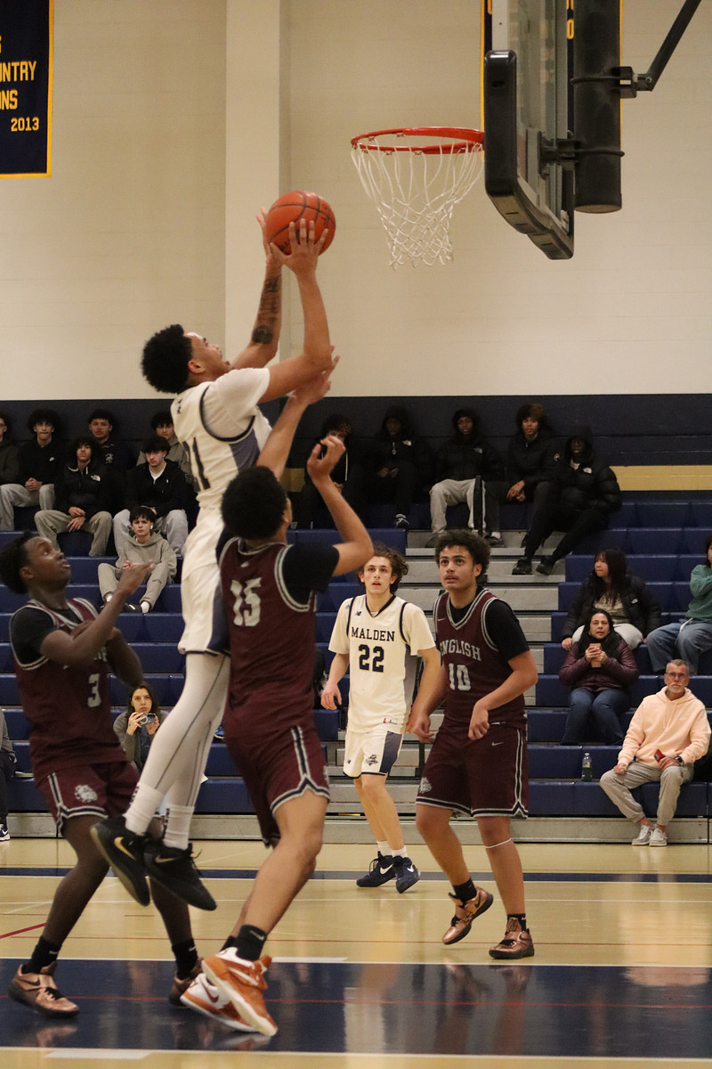 At the start of the second quarter, sophomore Jason Minervini demonstrated his presence on the team, stepping up and hitting a huge three, maintaining the momentum on Malden’s side. This was quickly followed by a massive block by Dias again. Malden had the energy, passion, and leadership, and was in complete control of the game, 33-20, with 5:34 left in the quarter. However, Lynn was feisty and refused to go down without a fight. Lynn English ended up going on a 13-0 run, scoring 13 points straight without letting Malden get a single point. Dias, however, put a stop to this 13-0 run by scoring a layup, making the score 42-35, English up at the end of second quarter. “Coach John McGlynn helped me a lot, and now I’m more confident when I get the ball and I know that none of my opponents can stop me so I just take my time and go get a bucket,” Dias shared.