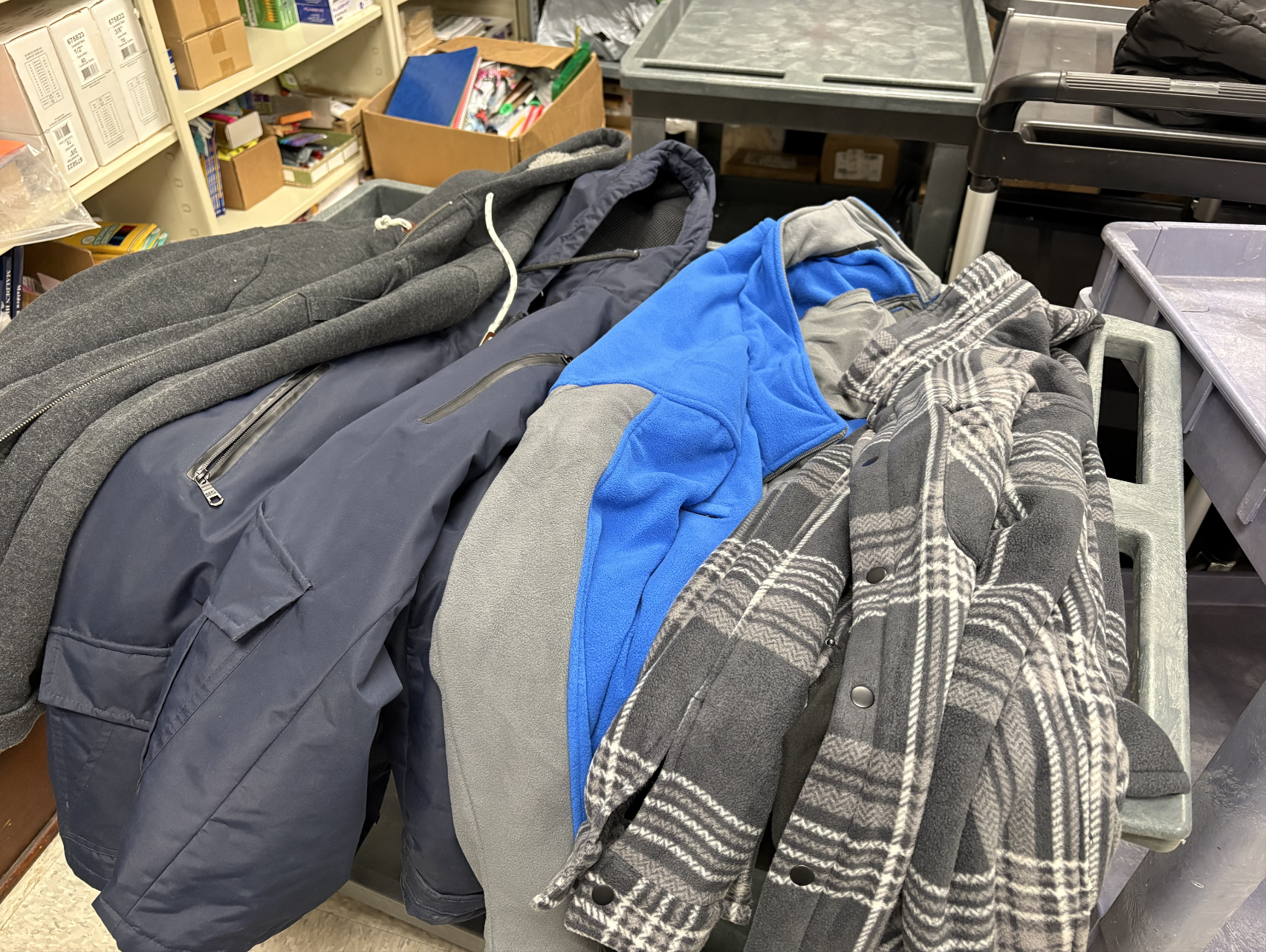 Pile of a donated jackets and coats on a storage cart. ANNA BUI