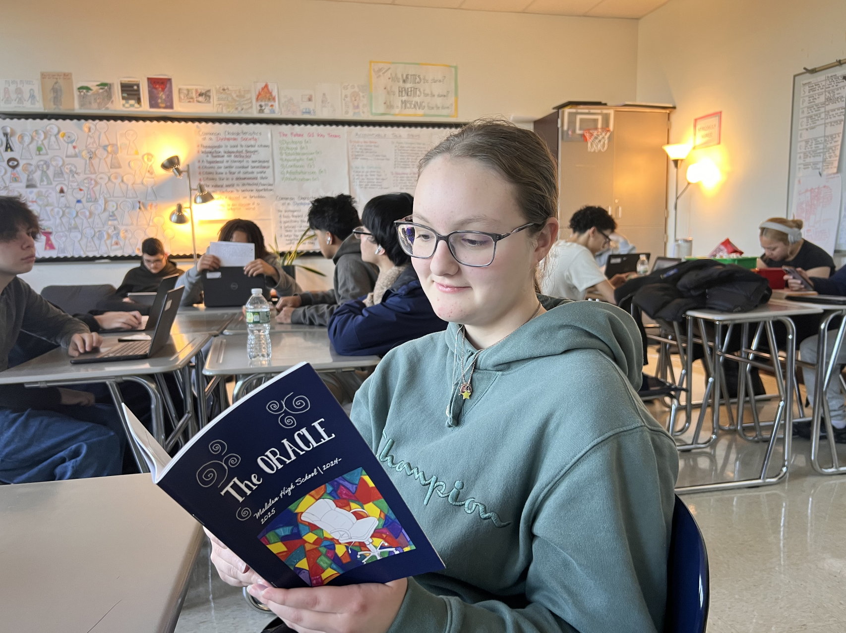 Junior Sarah Miller perusing the 2025 edition of the Oracle magazine. YEN NGUYEN