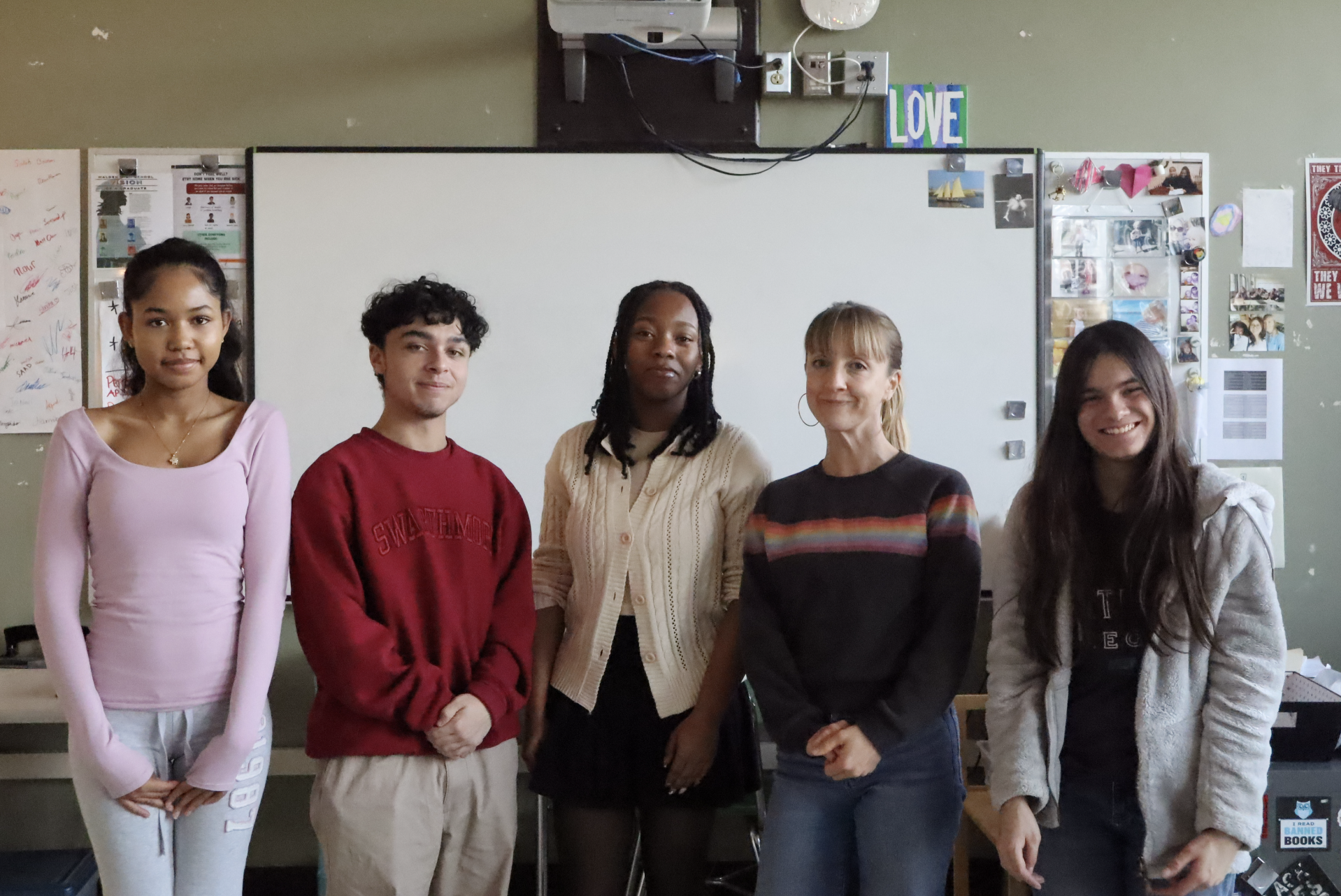 From left to right: senior Nour Howard, senior Thomas Conti, junior Woodmerlie Clerge Montimer, English teacher Nierika Nims, and junior Marisa Mantilla, members of the literary society posing for a photo. ISRAA MALHOUNI