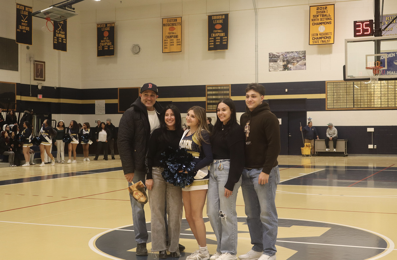 That night, cheer coach Briana Silva-Couture individually announced the team’s eleven seniors as they each walked towards the middle of the gym, taking photos with their families and friends. The seniors consisted of captain Claudia Hernandez Escobar, captain Taliyah Lauture, captain Patricia Mukasa, Rachel Valladares Lanza, Delina Yohannes (also Editor-in-Chief of Web and Mobile for the Blue and Gold), Nour Jaayfer, Aaliyah Lopes, Sorin Mamouzette, Ndiaye Oliver-Destine, Olivia Sateriale, and Lorella Beechin.