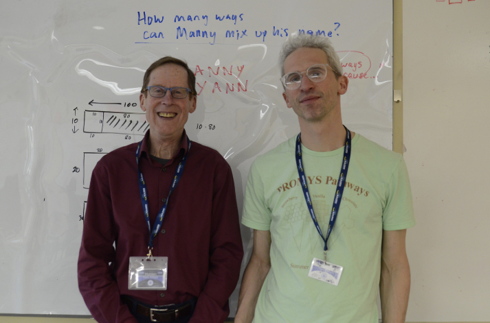 Advisor Mason Gohl with Advisor Mark Woods together in front of math work. KEVIN PRUM