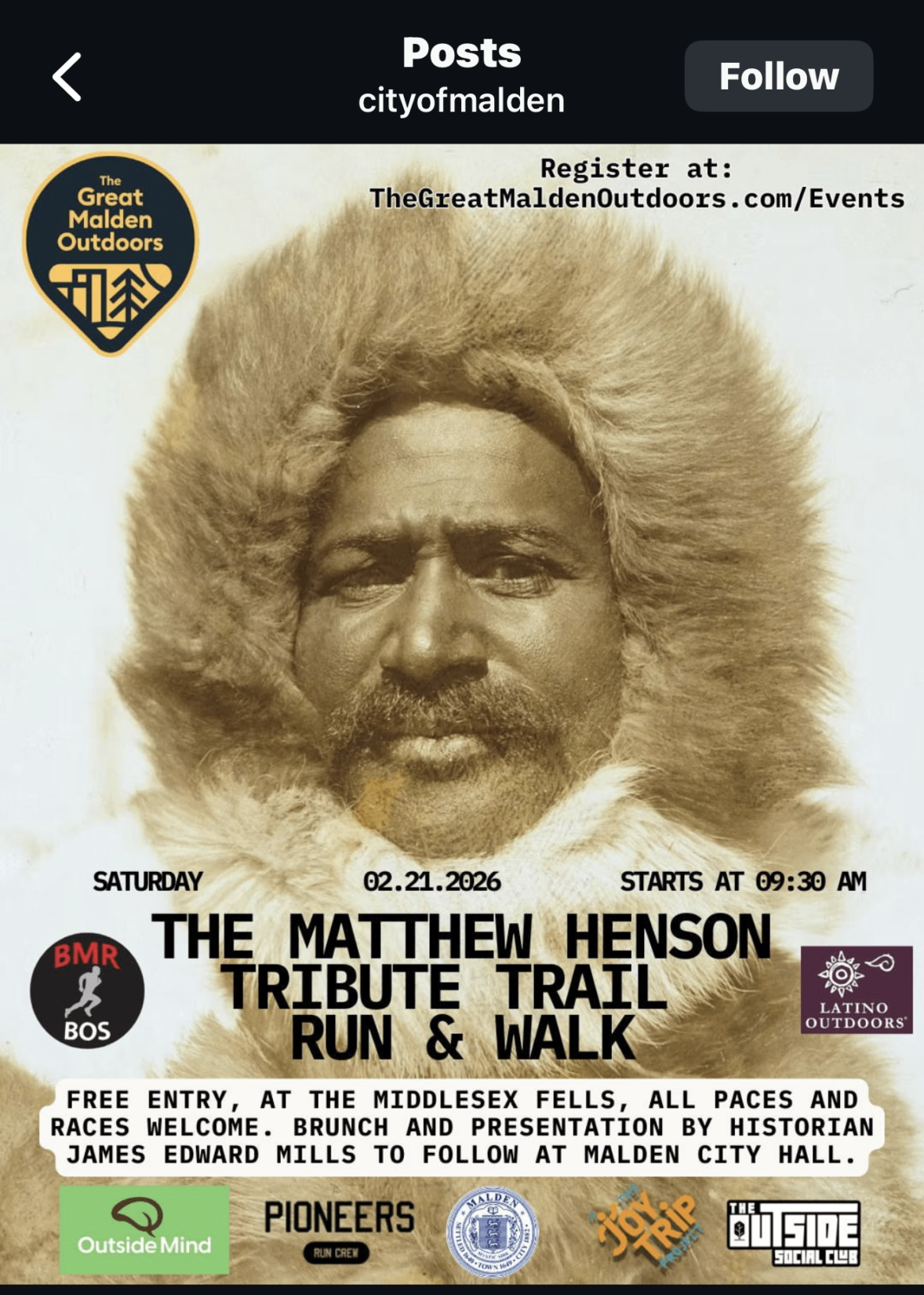 Several events around Malden have been hosted to celebrate this month. On February 2nd, the Matthew Henson Tribute took place in Middlesex Fells. A free run featuring a 1.5 mile and 3 mile guided route dedicated to Matthew Henson, the first Black American explorer to reach the Arctic. After the run, there was a catered brunch and presentation by historian James Edward Mills about Henson’s life at Malden City Hall.