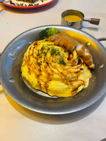Picture of “Slippery Eggs Over Rice with Malaysian Style Curry Chicken Chop.” EVELYN RUAN